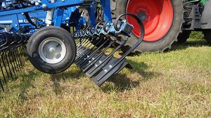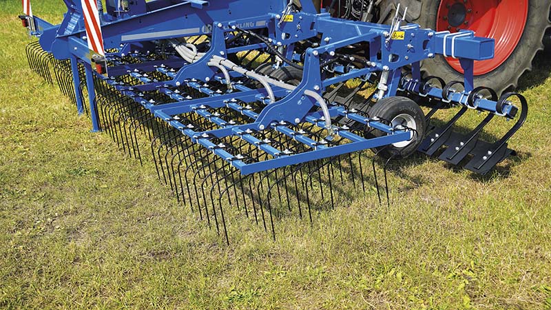 Jedes Striegelfeld wird über ein Parallelogramm geführt, so dass sich jedes Feld optimal dem Untergrund anpassen kann. Dies verhindert gleichzeitig ein Aufschaukeln und Springen bei zügiger Fahrt. Gerade bei der Neueinsaat von Gras oder Raps ist die individuelle Tiefenführung der Striegelfelder unverzichtbar.