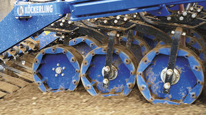 Eine Säeinheit besteht aus einer vorlaufenden Tastrolle und einem massive Säzinken. Auf den 190 mm breiten Tastrollen lasten etwa 90% des Maschinengewichtes, das sorgt zunächst einmal für eine ganzflächige und sehr gleichmäßige Rückverfestigung. Grobe Bodenaggregate werden durch das hohe Gewicht zuverlässig zerkleinert und eingeebnet. Zudem sorgen die Tastrollen für einen ruhigen Lauf und eine präzise Führung des Säzinkens. Damit kein Boden anhaftet und die Ablagetiefe beeinflusst, bestehen die Tastrollen aus einer Vielkantrolle mit umlaufendem Gummiband. Dieses unempfindliche Gummiband besteht aus mehreren Lagen und ist beweglich. Durch das Walken des Gummibandes während der Arbeit, löst sich anhaftender Boden sofort und die Einsatzsicherheit ist gewährleistet.