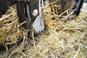 Durch die drehenden Tastrollen neben den Zinken, wird die organische Masse vor dem Schar herunter gedrückt und „überrollt“.