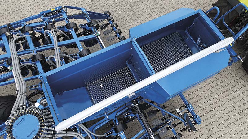 Der Tank hat 3.000, 3.500 oder 4.000 Liter Volumen, je nach Modell. Durch die großzügige Öffnung, kann der Tank auch per Schaufel oder Big Bag bequem befüllt werden. In der Combi-Version ist der Tank quer geteilt und hat eine 40/60 Aufteilung. Das stabile Gitter im Inneren des Tanks schützt das Dosiergerät vor Fremdkörpern und es können sogar Saatgutsäcke darauf mitgeführt werden.